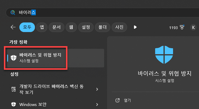 윈도우 검색에 [바이러스 및 위협 방지]를 검색해서 메뉴를 열어 줍니다.