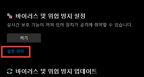 바이러스 및 위협 방지 설정에서 [설정 관리] 메뉴로 들어가 줍니다.